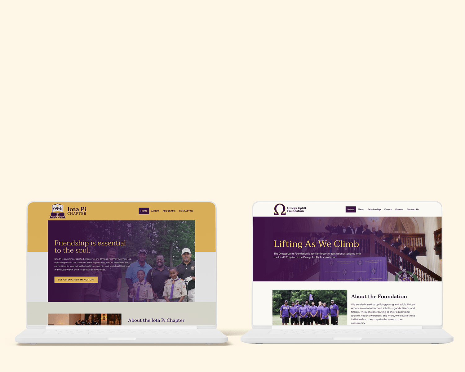 Donating time and talent for the community with Code for Good, CurlyHost designed and developed a pair of partner sites for Iota Pi and Omega Uplift. Using the brand colors, CurlyHost created a consistent visual identity with unique features for each site.